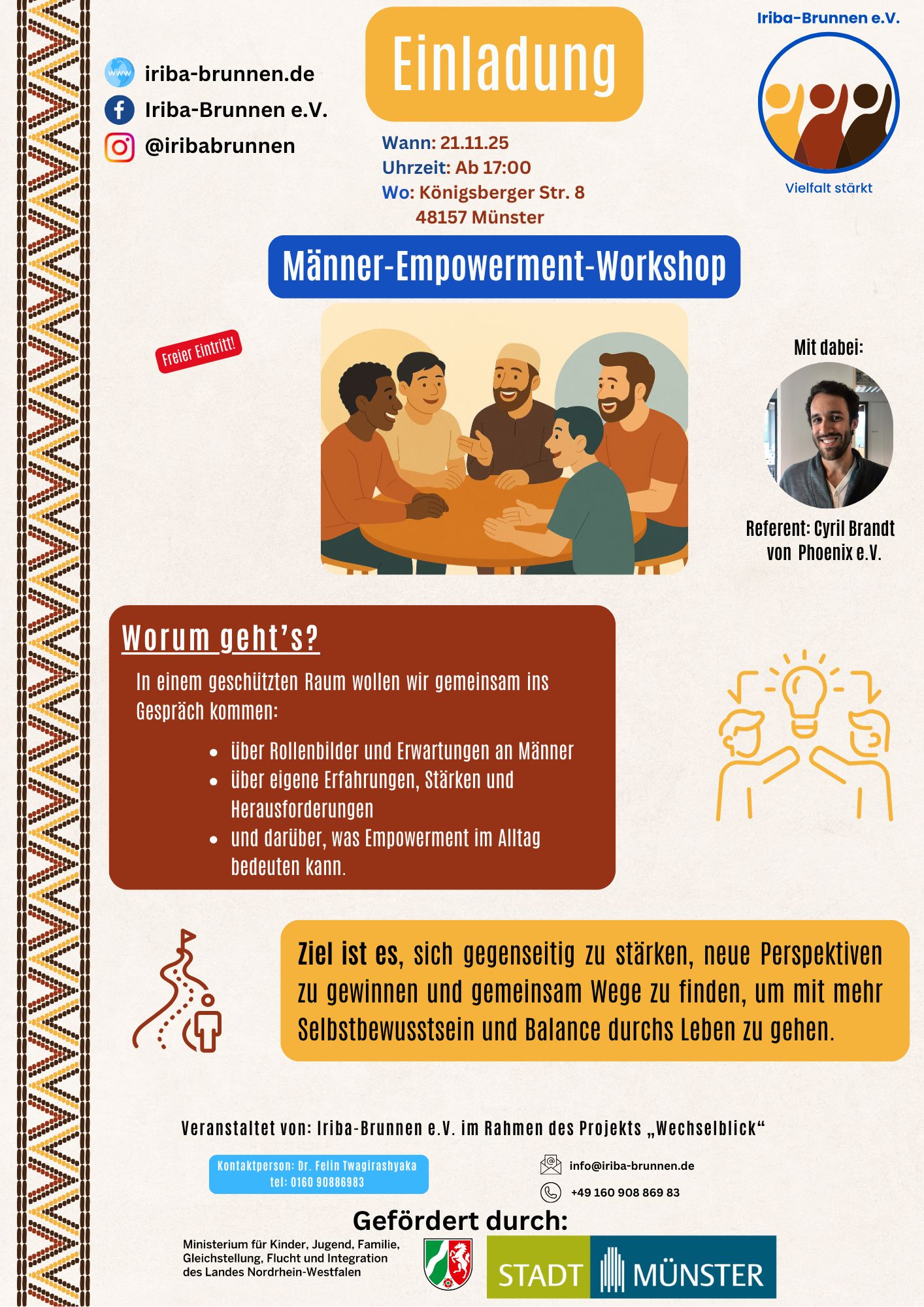 Am 21. November 2025 lädt Iriba-Brunnen e.V. zu einem offenen Austausch für Männer ein. In einem geschützten Raum sprechen wir über Rollenbilder, Erwartungen, persönliche Erfahrungen und Herausforderungen. Gemeinsam wollen wir herausfinden, was Empowerment im Alltag bedeutet und wie gegenseitige Unterstützung zu mehr Selbstbewusstsein und innerer Balance führen kann.